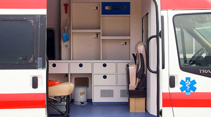 醫療艙內飾具有防腐、防霉、易清洗等特點,便于醫護人員的清潔,整理;座椅均包裹藍色防真皮、車內各面采用圓面設計、造型美觀同時可防止對醫護人員與病患的再次傷害。
