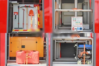 消防車標配:空氣泡沫槍、消防吸水管、濾水器、分水器、集水器、消防水帶、水帶掛鉤、水帶包布、異徑接口、同型接口、直流水槍、開花水槍、直流開關水槍、消防鎬、地上扳手、地下扳手、吸水管扳手、水帶護橋、泡沫器吸液管、腰斧、消防斧、鐵鍬、撬扛等。